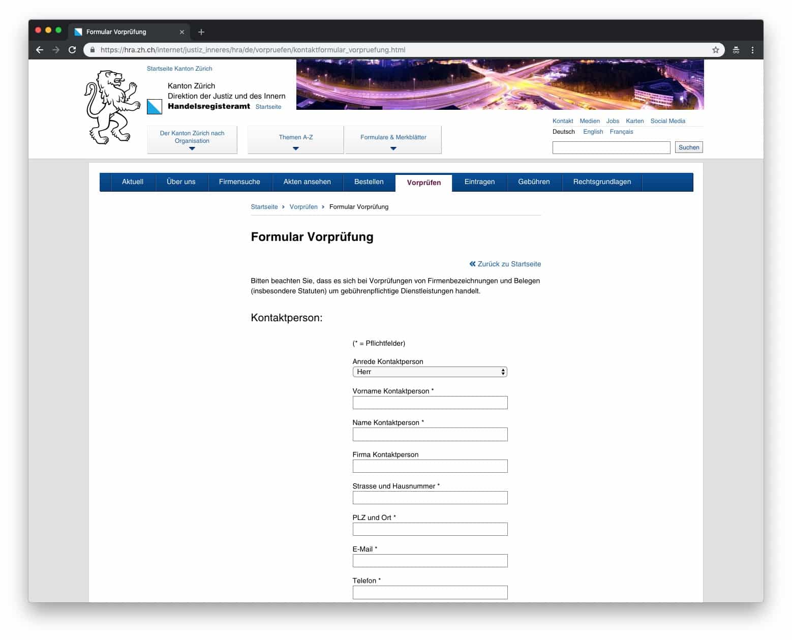 Ab sofort können Personen vorzuprüfende Entwürfe von Eintragungsunterlagen über ein Web-Formular dem Handelsregisteramt des Kantons Zürich einreichen.