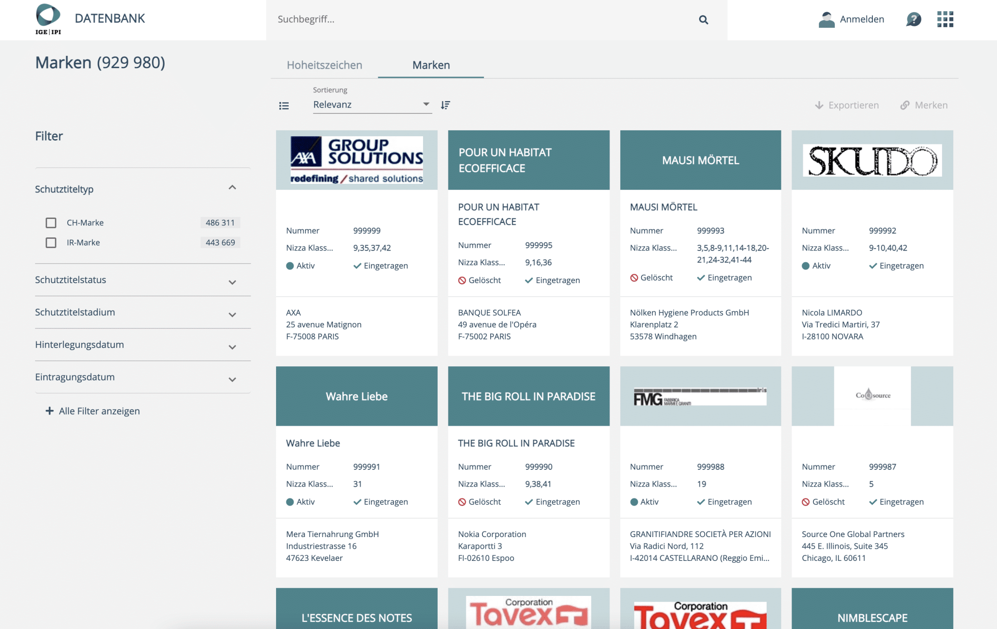 Das Institut für geistiges Eigentum (IGE) hat seine Markendatenbank (auch „IGE-Marken-Datenbank“) hinsichtlich Informations-, Zugangs- und Markenänderungs-Möglichkeiten optimiert: