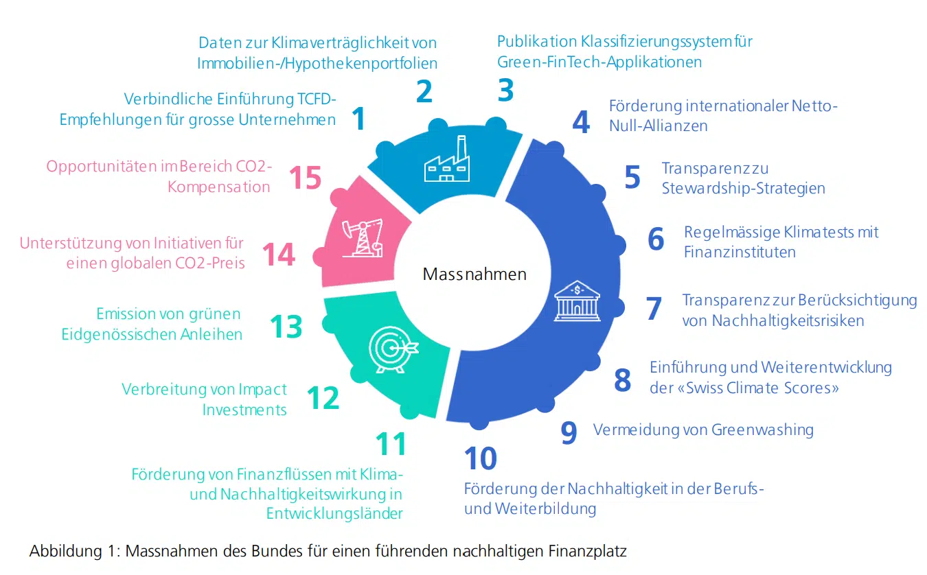 - Mit 15 Massnahmen für die Jahre 2022 bis 2025 soll der Schweizer Finanzplatz seine Position als einer der weltweit führenden Standorte für nachhaltige Finanzen weiter ausbauen.