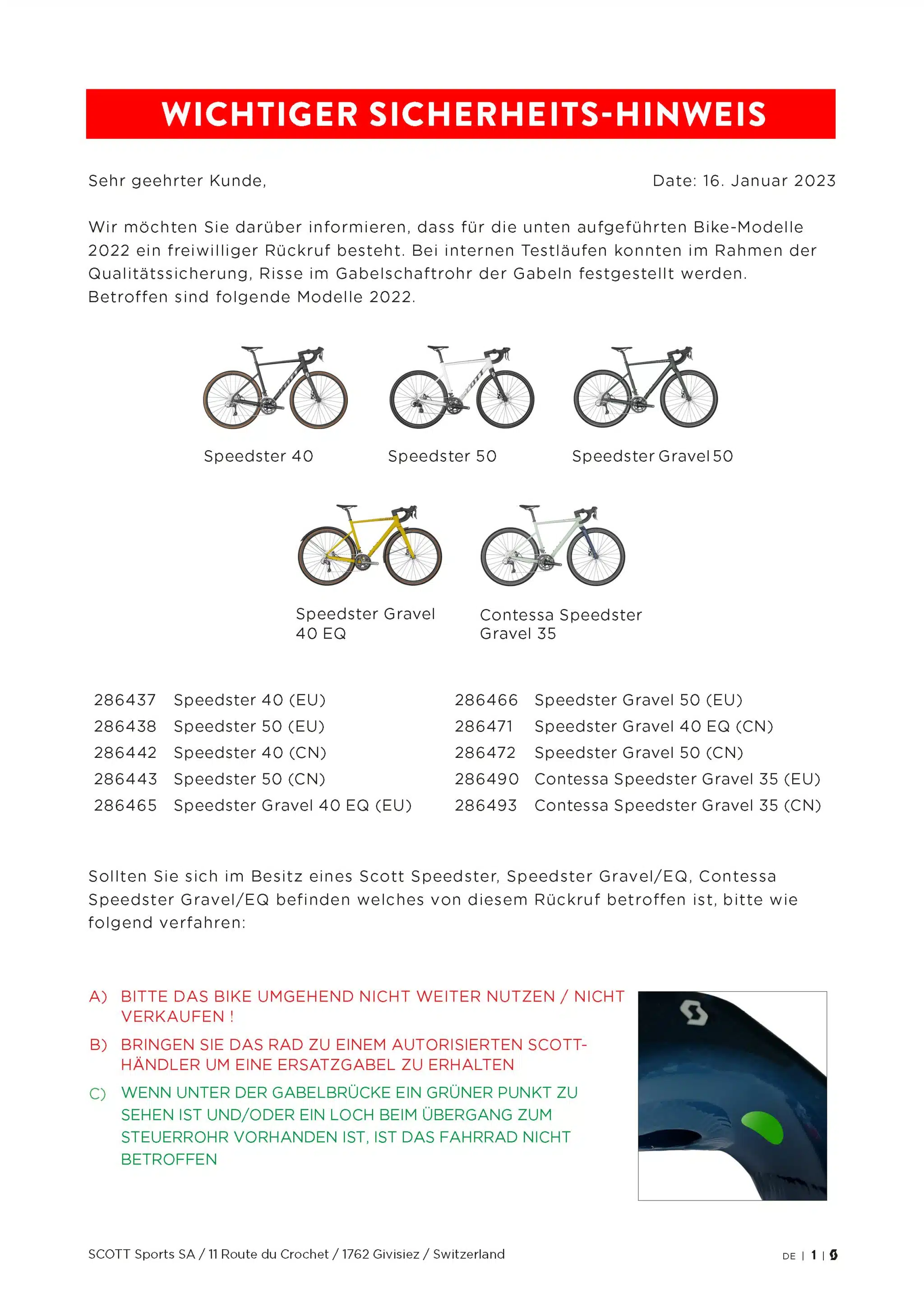 In Zusammenarbeit mit der BFU, Beratungsstelle für Unfallverhütung, ruft Scott Sports AG bestimmte Bike-Modelle 2022 «Speedster, Speedster Gravel/EQ und Contessa Speedster Gravel/EQ» zurück: