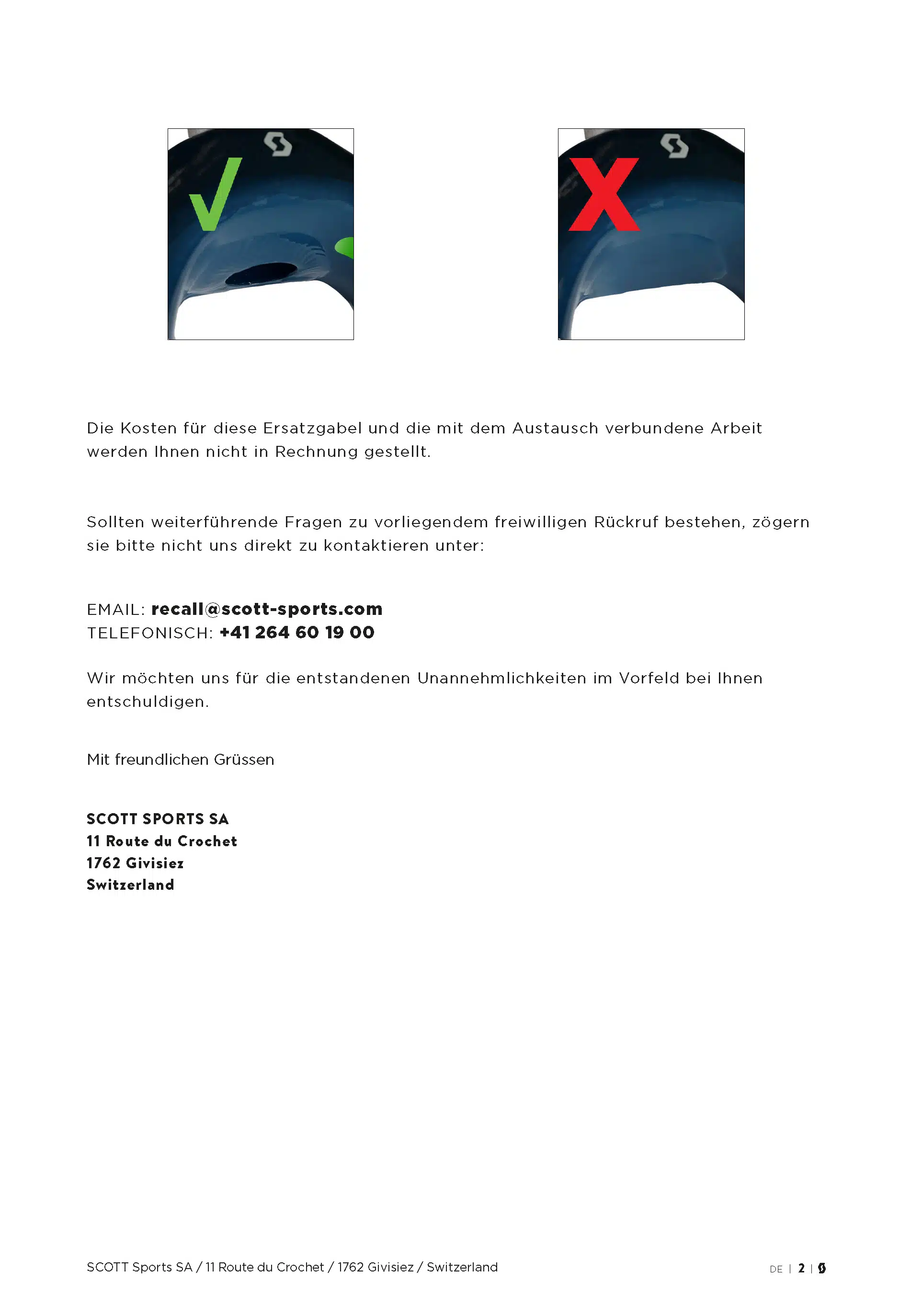 Konsumentinnen und Konsumenten, die ein betroffenes Bike besitzen, sind aufgefordert, dieses ab sofort nicht mehr zu verwenden und an einen autorisierten Scott-Händler zurückzubringen. Die betroffenen Gabeln werden kostenlos ausgetauscht.