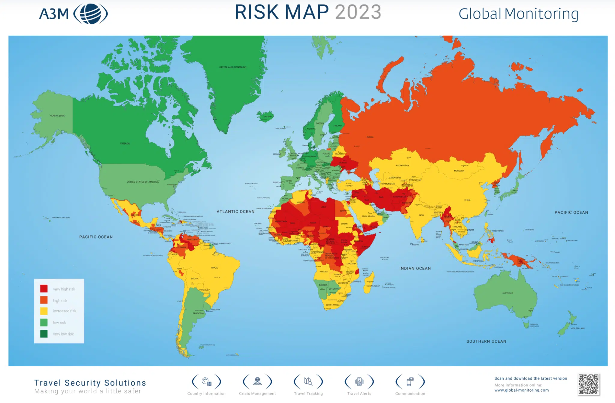 A3M und Global Monitoring haben eine Studien-Grafik erstellt, die sog. Risk Map 2023, aus der die Risikogebiete auf einen Blick ersichtlich sind: