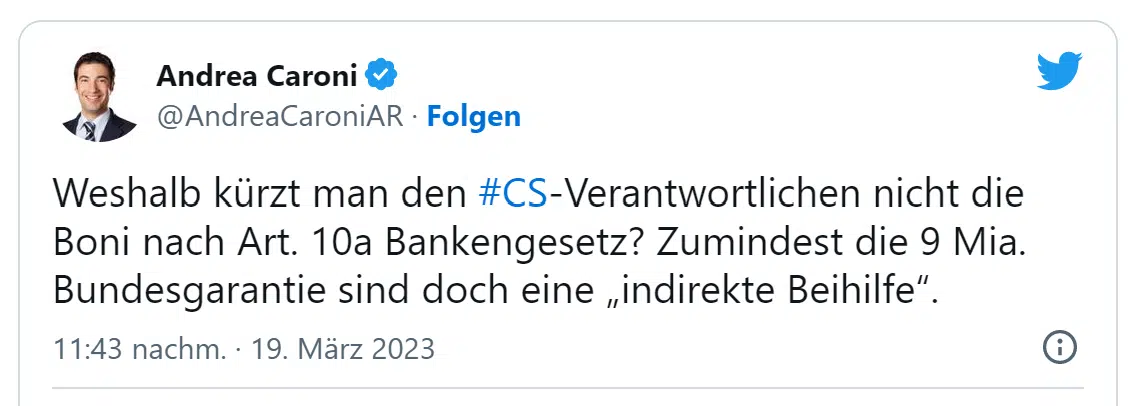 FDP-Ständerat Andrea Caroni (AR) zeigte sich bereits am SO 19.03.2023 irritiert. Er meldete, das Bankengesetz lasse eine Boni-Kürzung zu.