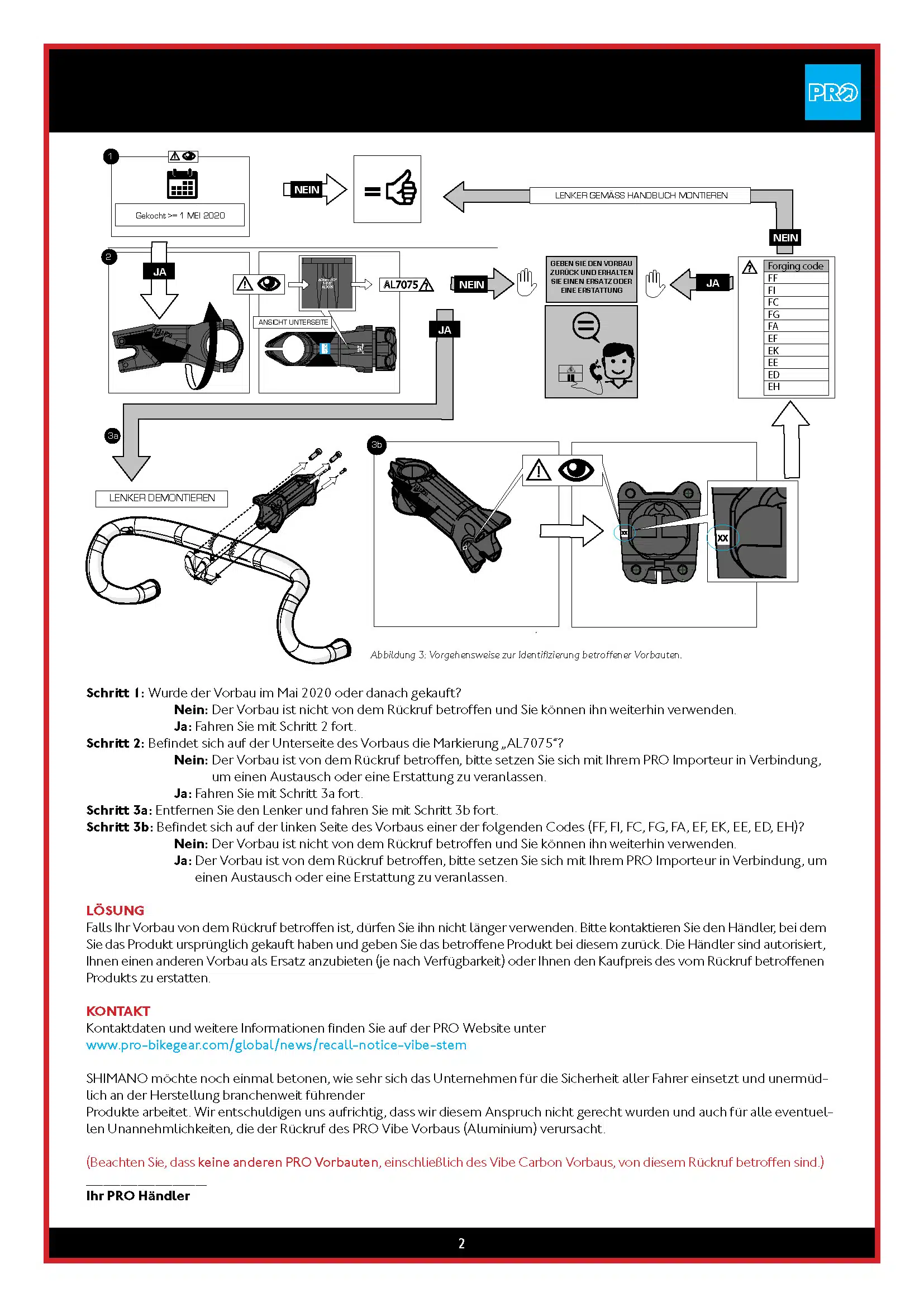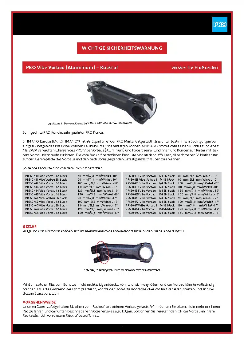 In Zusammenarbeit mit der BFU, Beratungsstelle für Unfallverhütung, ruft Shimano Europe B.V. bestimmte Chargen des PRO Vibe Vorbaus (Aluminium) zurück.