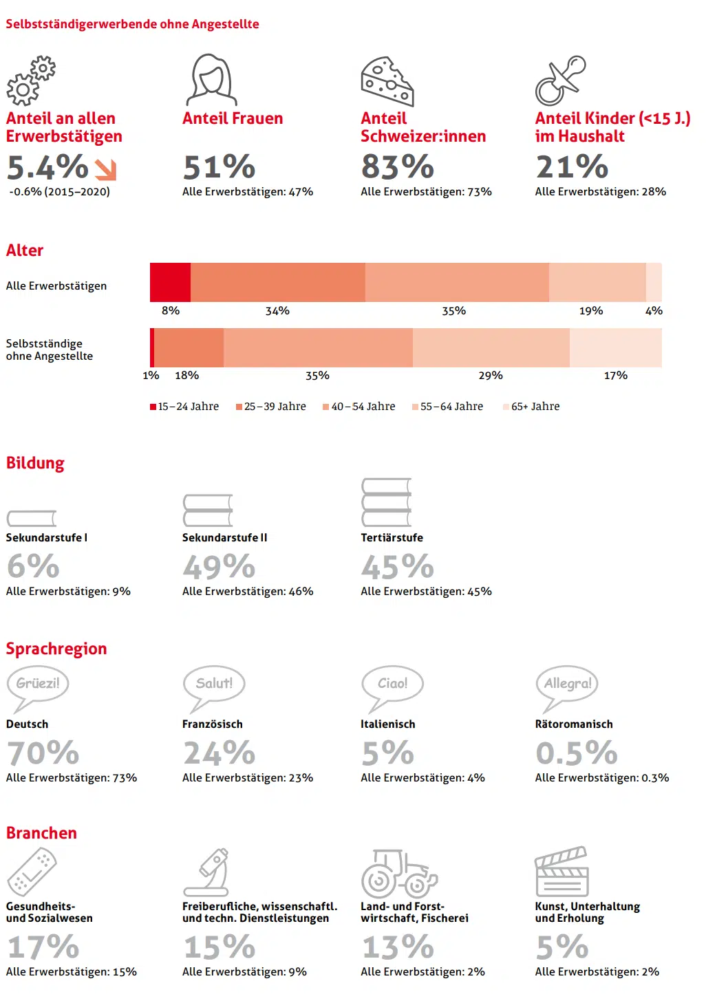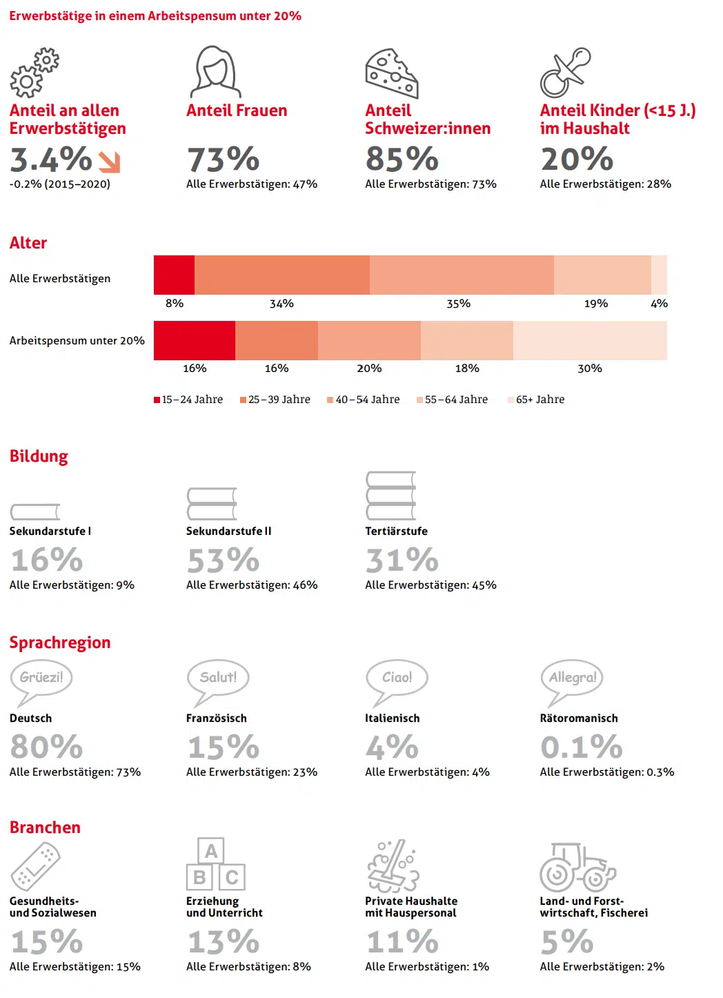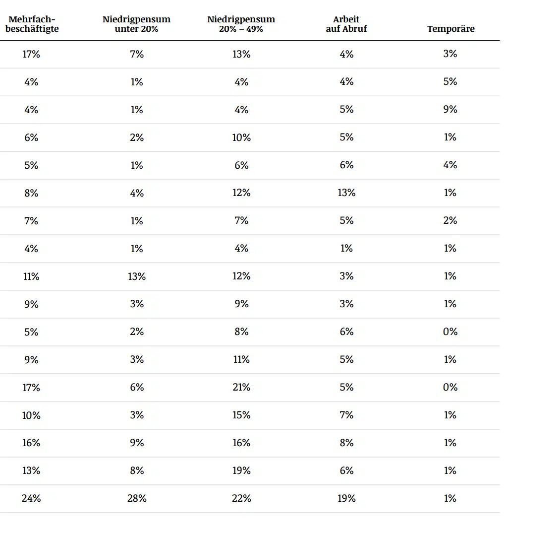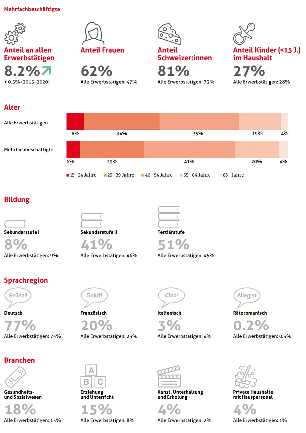 - Unter Schweizerinnen und Schweizern sind Selbstständigkeit, Mehrfachbeschäftigung oder niedrige Arbeitspensen weit verbreitet.