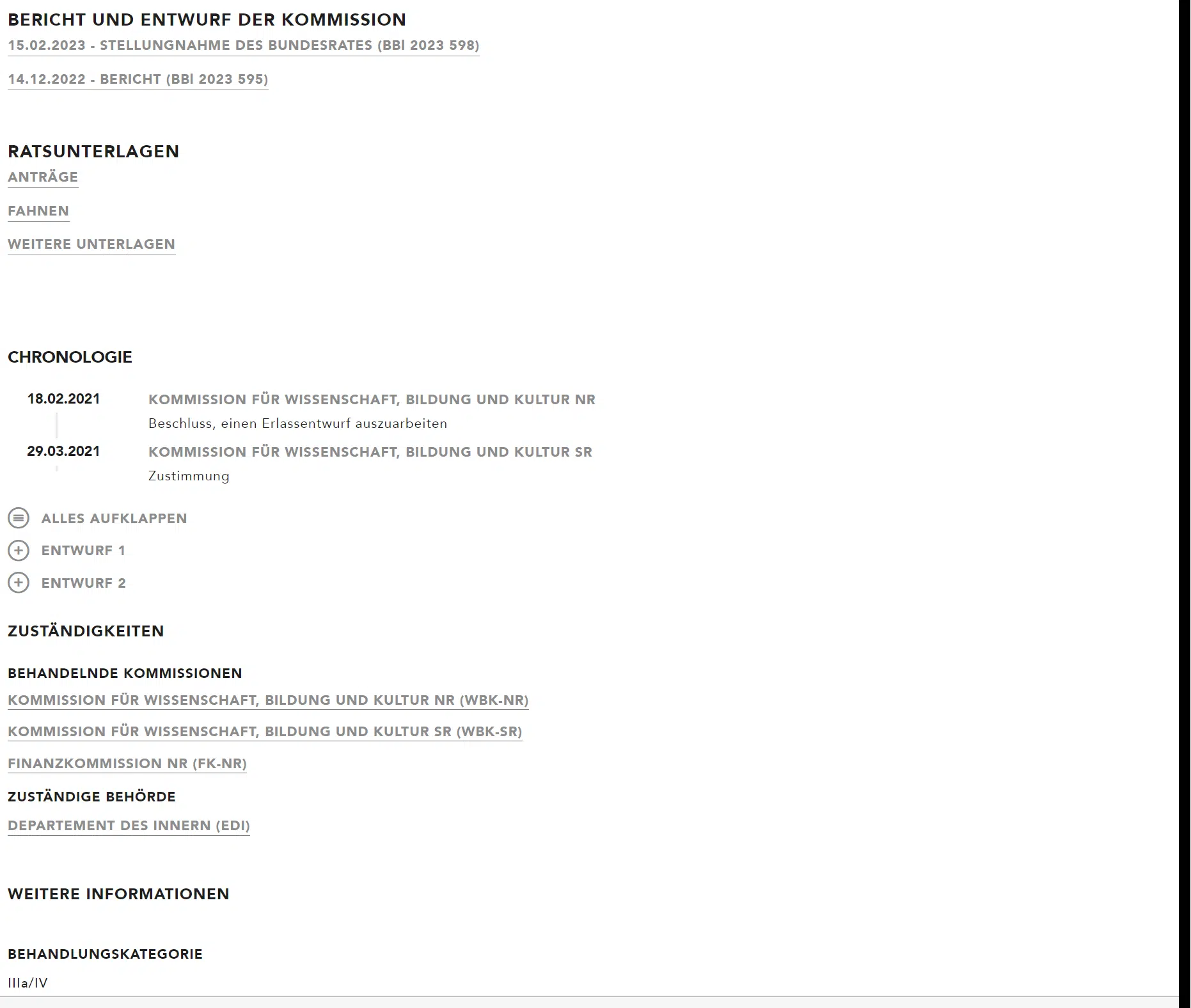 Die WBK-S will gemäss Medienmitteilung vom 21.11.2023 an ihrer nächsten Sitzung im Januar 2024 einen Vernehmlassungsbericht verabschieden und die Vernehmlassung dazu eröffnen.