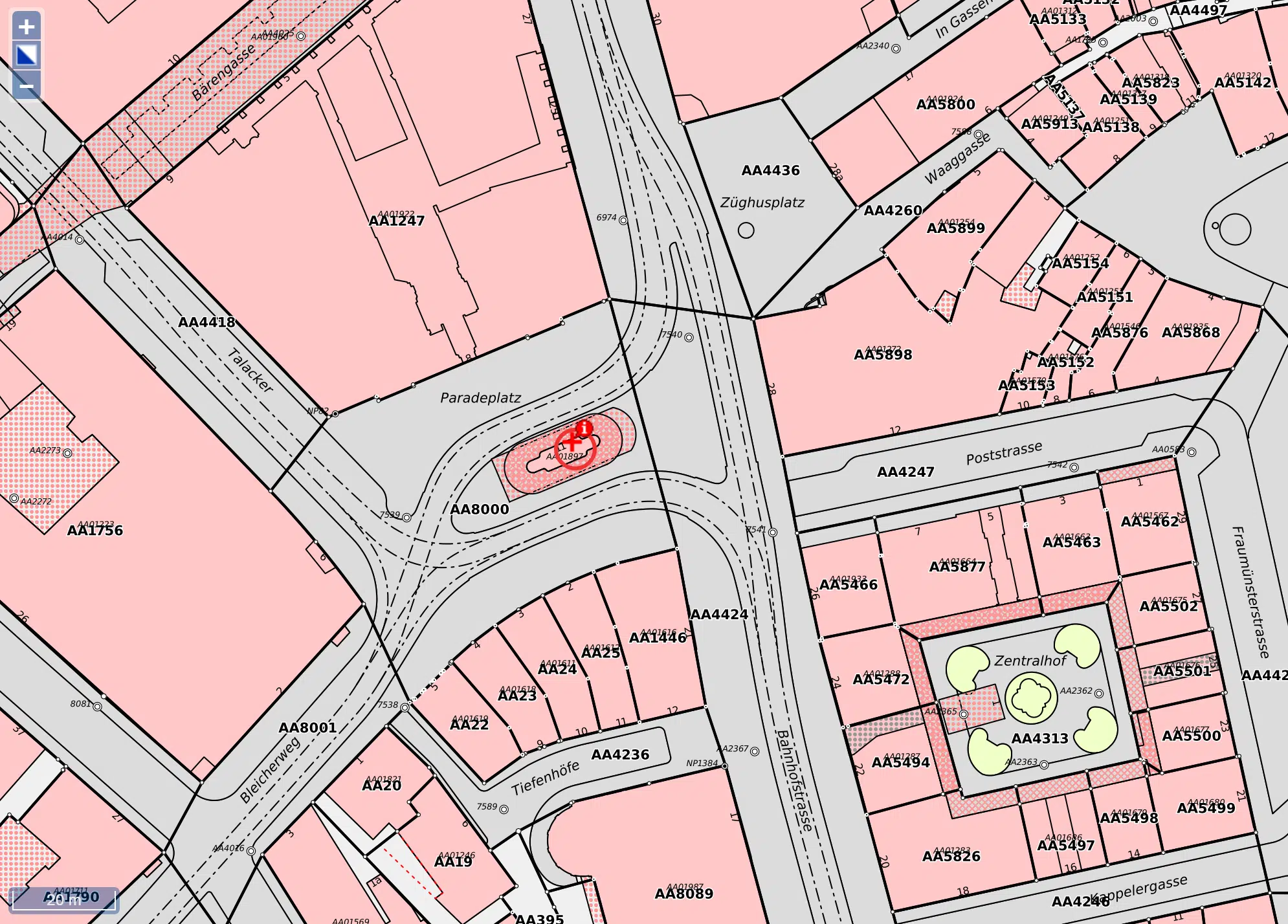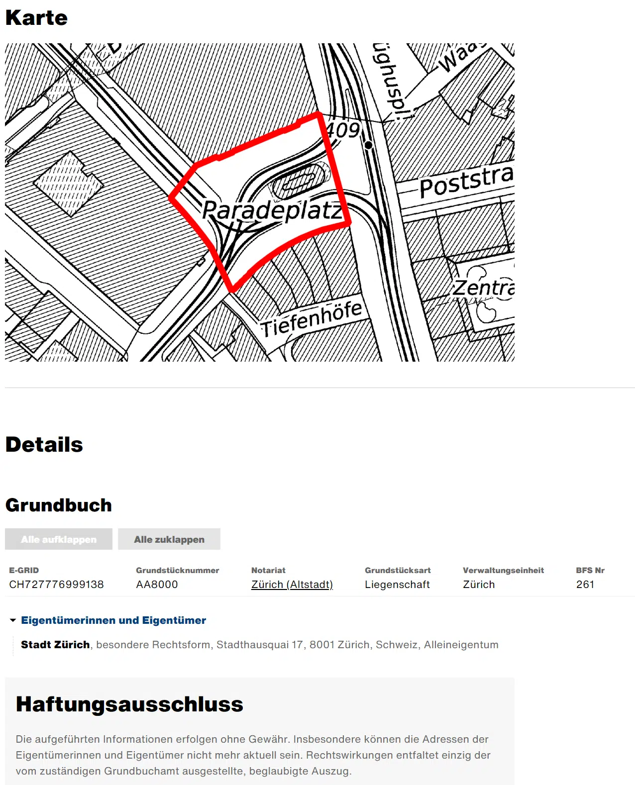 - Karte mit Eigentümer-Details und Eigentumsart (am Beispiel «Paradeplatz»)