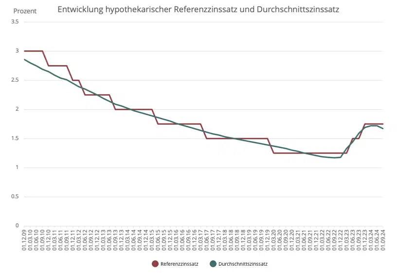 Datenquelle: Entwicklung Referenzzinssatz und Durchschnittszinssatz | bwo.admin.ch; eigene Darstellung © LawMedia AG 2024