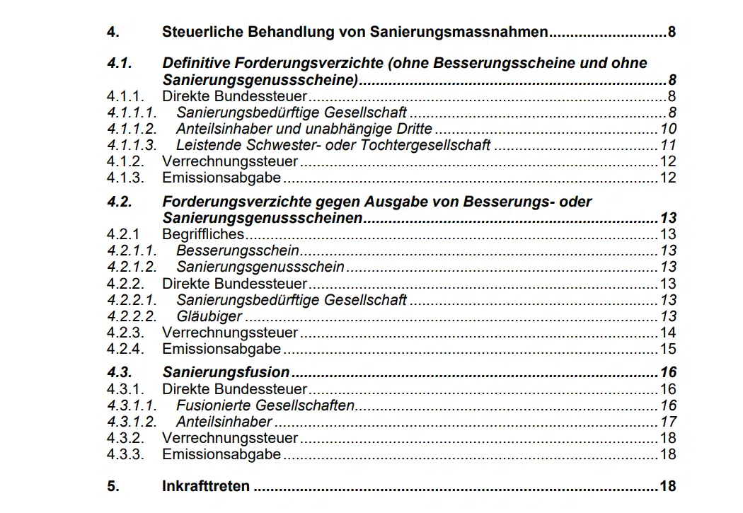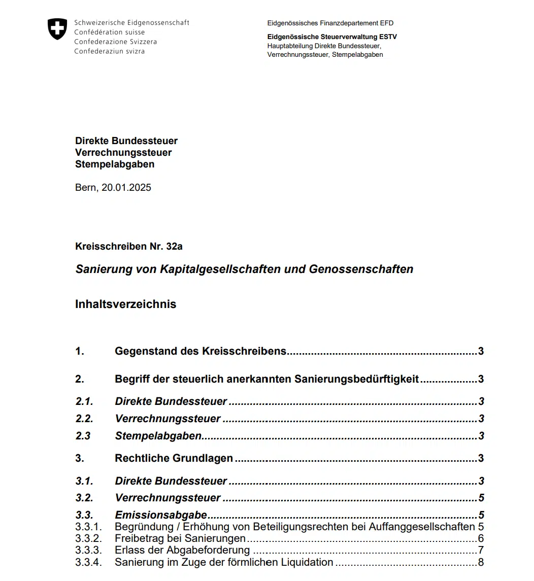 Die Eidgenössische Steuerverwaltung (ESTV) hat das Kreisschreiben «Sanierung von Kapitalgesellschaften und Genossenschaften (Direkte Bundessteuer, Verrechnungssteuer und Stempelabgaben)» am 20.01.2025 publiziert.